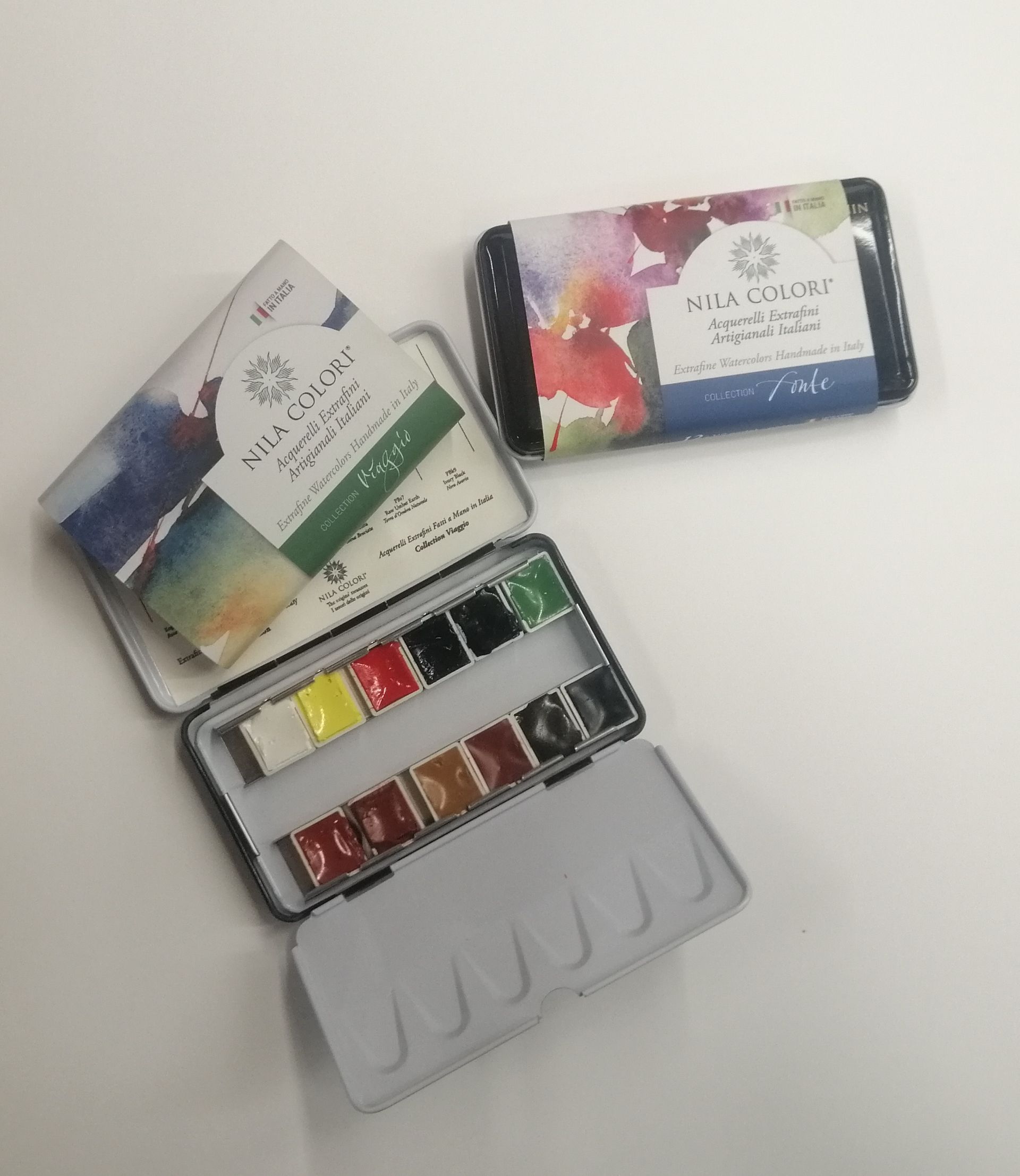 Per quanto riguarda i colori ad Acquarello si va dai marchi più noti e fidati come Winsor and Newton (professionali e Cotman) sia in confezione che venduti singolarmente, a marchi artigianali italiani come "Nila colori e Di Volo" con i suoi acquarelli al miele. Sono presenti in negozio anche gli acquarelli Van Gogh Royal Talens sia in tubo che in mezzo godet.